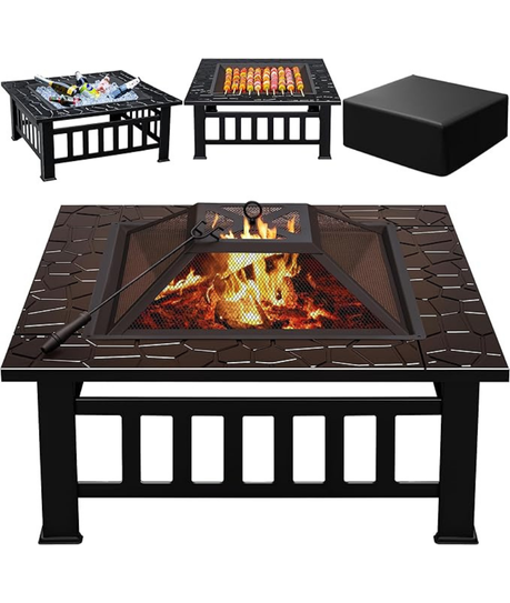Greesum Multifunctional Patio Fire Pit Table, 32in Square Metal BBQme Firepit Stove